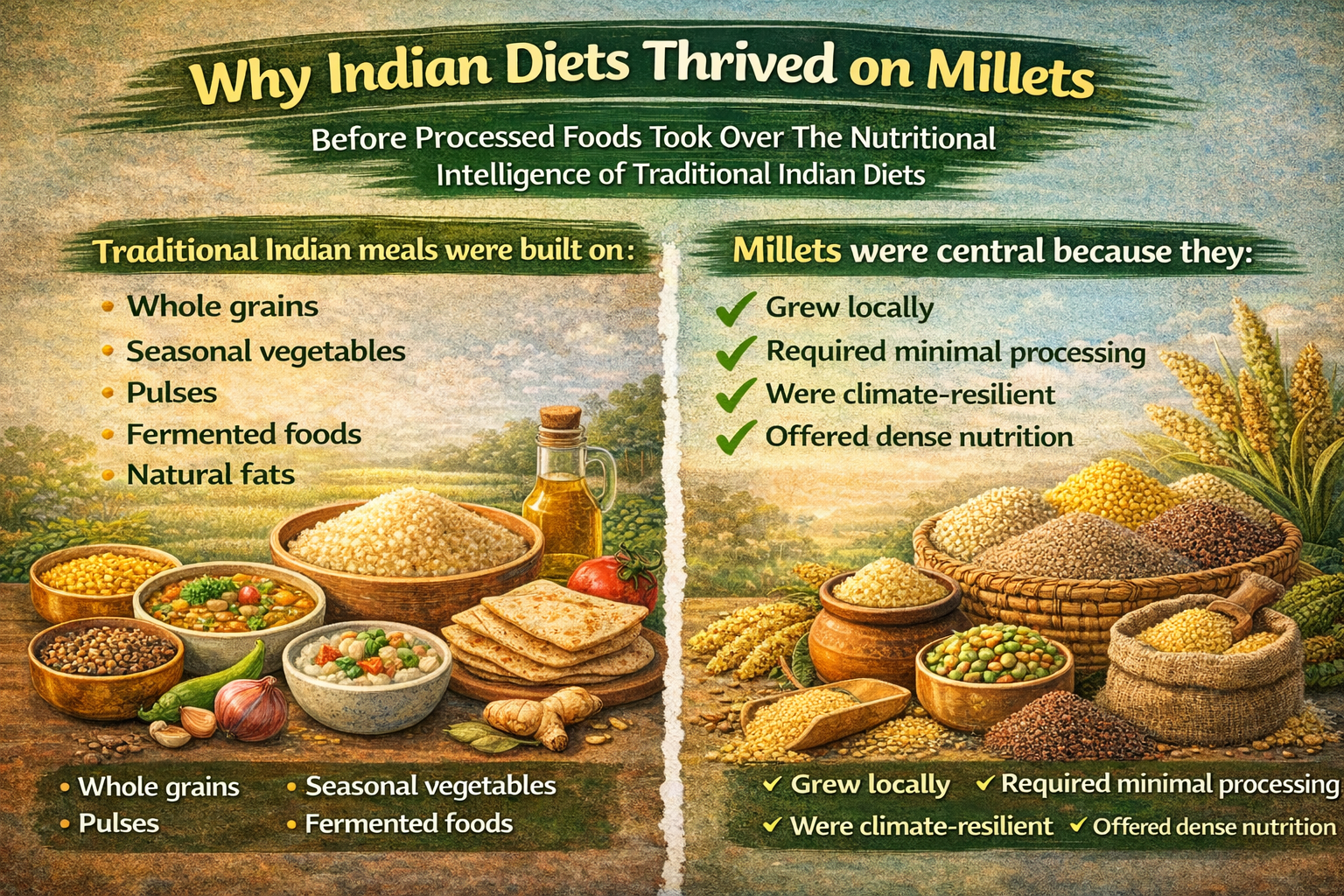 Before supermarkets were filled with refined flour snacks, protein bars, and packaged cereals, Indian households relied on something far simpler — millets and pulses. For.