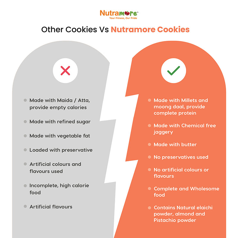 - Perfect Anytime Snack – Crafted with care using a blend of nutritious millets and the richness of almond, pistachios, these cookies offer a delightful crunch and a burst of delicious taste in every bite. Wholesome snack to start your day, mid-day snack for tiffin, on the go snacking.